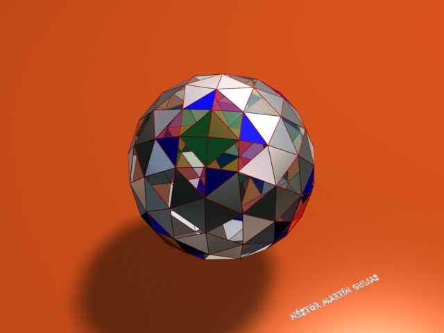 En la figura observamos cómo se puede transformar un poliedro arquimediano (icosaedro truncado) en una esfera geodésica, esto es, en una estructura construida con caras triangulares casi equiláteras, de manera que todos los vértices de los triángulos de la esfera equidistan del centro de la misma. Sobre cada una de las caras de la figura se construye una pirámide cuya base es la misma cara. Para saber cuál es su altura debemos pasar por el punto medio de la cara una recta que pase también por el centro de la esfera que inscribe el poliedro. Esta recta cortará a la esfera en la que está inscrito el poliedro en un punto y este es el vértice superior de la pirámide. A continuación unimos este vértice con cada uno de los vértices de la base que son los vértices del polígono regular (caras del poliedro arquimediano). De esta forma tenemos que todos los puntos de la esfera geodésica equidistan del centro y todas sus caras son triángulos casi equiláteros.